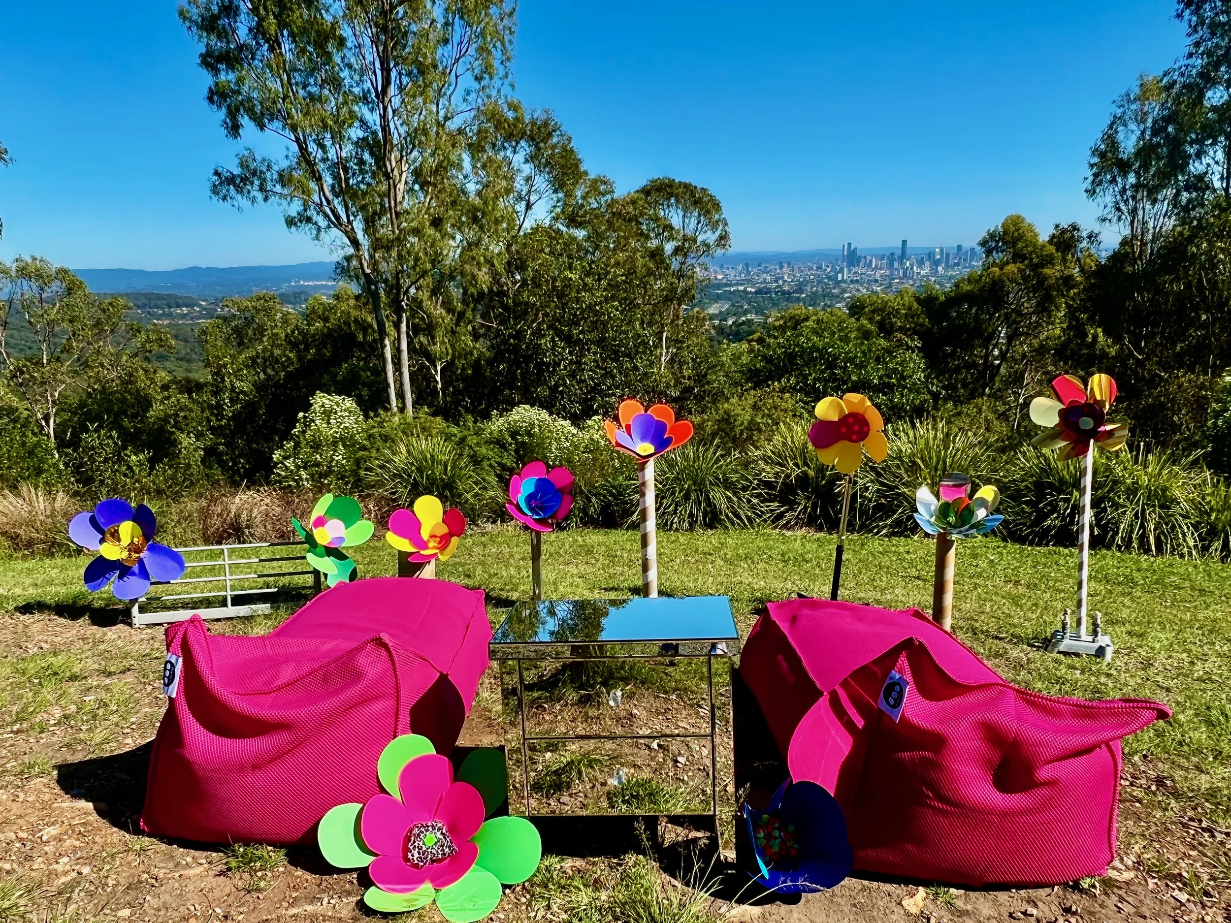 Flower Power is a large-scale participatory sculptural installation that operates as an immersive site for nature bathing, sensory attention and shared pause. Installed within an outdoor landscape, the work brings together saturated colour, sculptural seating and organic form to create a temporary environment shaped as much by atmosphere as by structure.