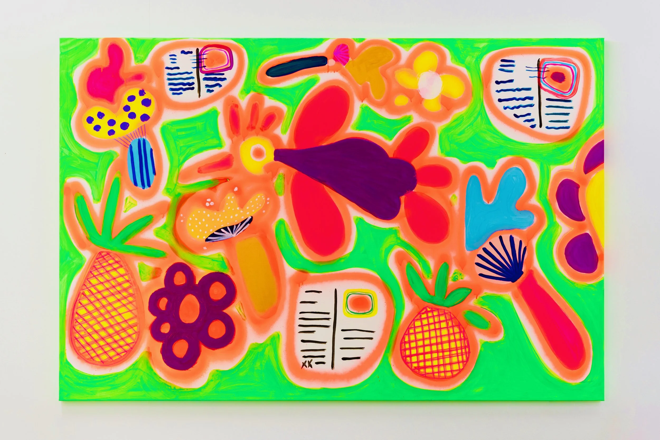 Drawing on Pop Art’s engagement with repetition, mass imagery and visual excess, the painting embraces abundance rather than hierarchy. Fluorescent colour intensifies this logic, amplifying visibility and urgency while resisting narrative resolution. Forms accumulate, overlap and float, producing a surface that oscillates between exuberance and instability.